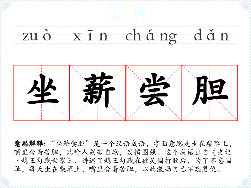 “坐薪尝胆”源自《史记·越王勾践世家》,描述了越王勾践在被吴国打败后的自我激励行为。随着时间的推移,这个成语被广泛用于各种语境,以表达坚韧和决心。