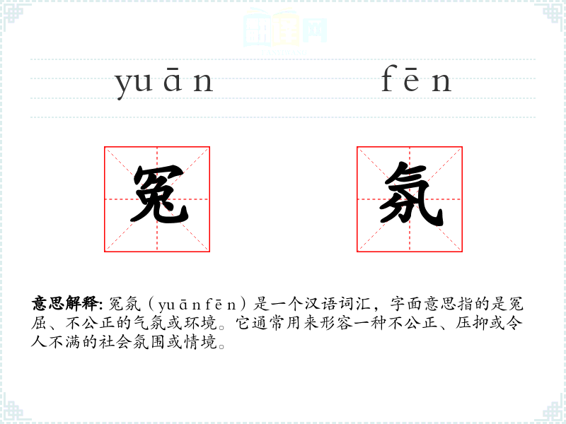 冤氛(yuān fēn)是一个汉语词汇,字面意思指的是冤屈、不公正的气氛或环境。它通常用来形容一种不公正、压抑或令人不满的社会氛围或情境。