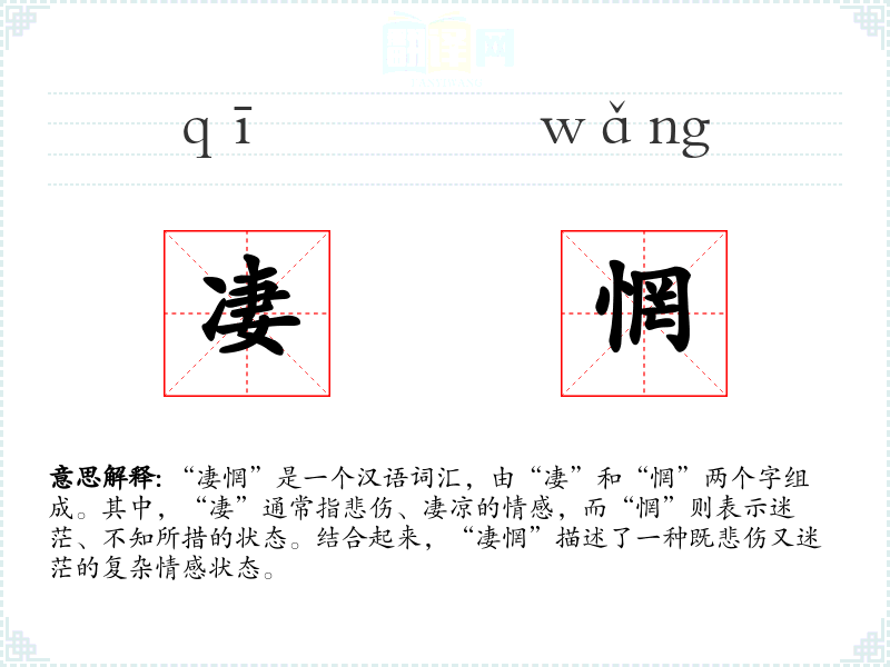 “凄惘”是一个汉语词汇,由“凄”和“惘”两个字组成。其中,“凄”通常指悲伤、凄凉的情感,而“惘”则表示迷茫、不知所措的状态。结合起来,“凄惘”描述了一种既悲伤又迷茫的复杂情感状态。
