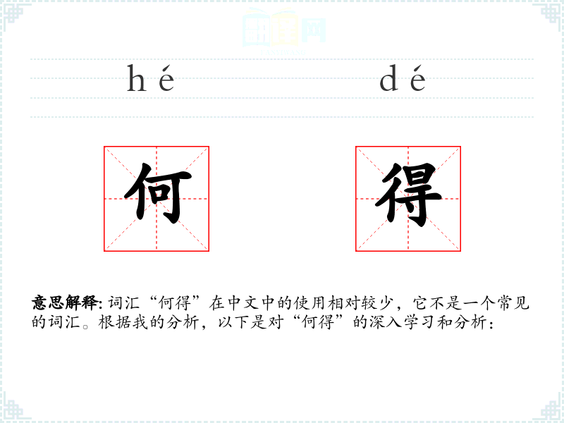 “何得”字面意思可以理解为“如何得到”或“怎么能”。它通常用于询问某种方式或方法来获得某物或达成某事。