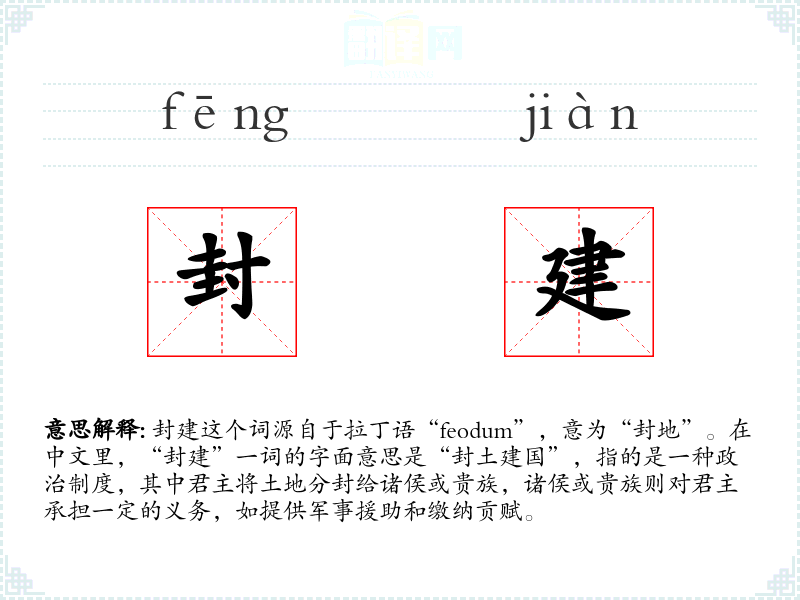 封建这个词源自于拉丁语“feodum”,意为“封地”。在中文里,“封建”一词的字面意思是“封土建国”,指的是一种政治制度,其中君主将土地分封给诸侯或贵族,诸侯或贵族则对君主承担一定的义务,如提供军事援助和缴纳贡赋。