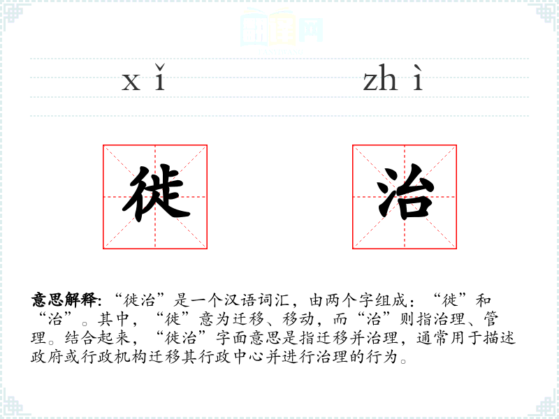 “徙”字最早见于甲骨文,原意为迁移。“治”字则有治理、管理之意,最早见于金文。两者结合形成的“徙治”一词,主要用于描述行政中心的迁移和治理行为,其使用在古代文献中较为常见。