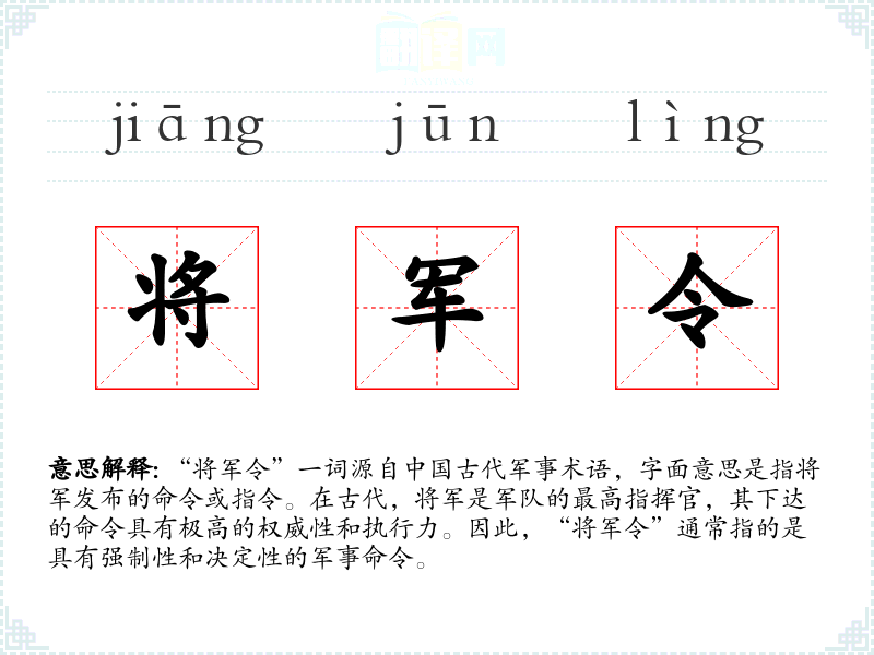 - 军令:指军队中的命令,与“将军令”含义相近,但范围更广,不一定特指将军的命令。