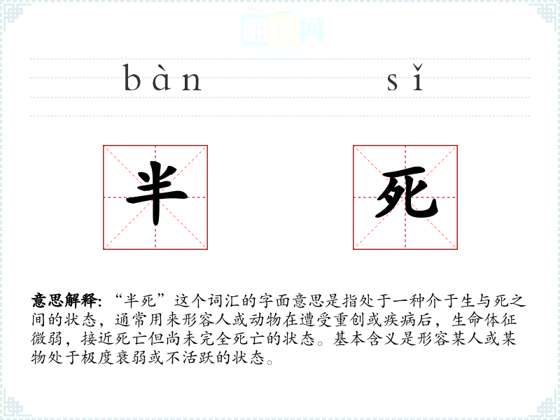 “半死”这个词汇在中文中的使用历史悠久,其结构简单,由“半”和“死”两个字组成,直接表达了介于两者之间的状态。在古代文献中也有类似的表达,如《左传》中有“半死不活”的说法,显示了其长期的使用历史。