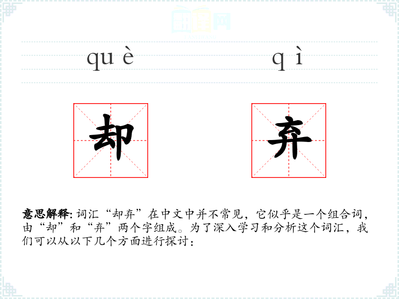 词汇“却弃”在中文中并不常见,它似乎是一个组合词,由“却”和“弃”两个字组成。为了深入学习和分析这个词汇,我们可以从以下几个方面进行探讨: