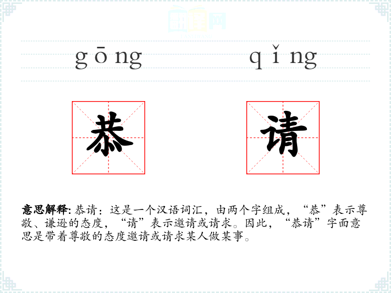 恭请:这是一个汉语词汇,由两个字组成,“恭”表示尊敬、谦逊的态度,“请”表示邀请或请求。因此,“恭请”字面意思是带着尊敬的态度邀请或请求某人做某事。