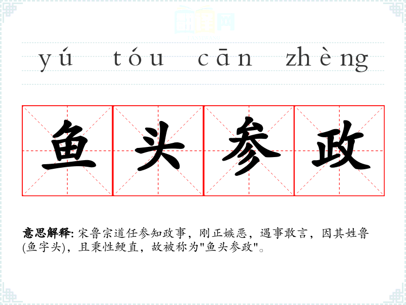 宋鲁宗道任参知政事,刚正嫉恶,遇事敢言,因其姓鲁(鱼字头),且秉性鲠直,故被称为"鱼头参政"。