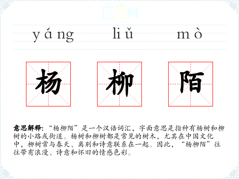 “杨柳陌”是一个汉语词汇,字面意思是指种有杨树和柳树的小路或街道。杨树和柳树都是常见的树木,尤其在**文化中,柳树常与春天、离别和诗意联系在一起。因此,“杨柳陌”往往带有浪漫、诗意和怀旧的情感色彩。