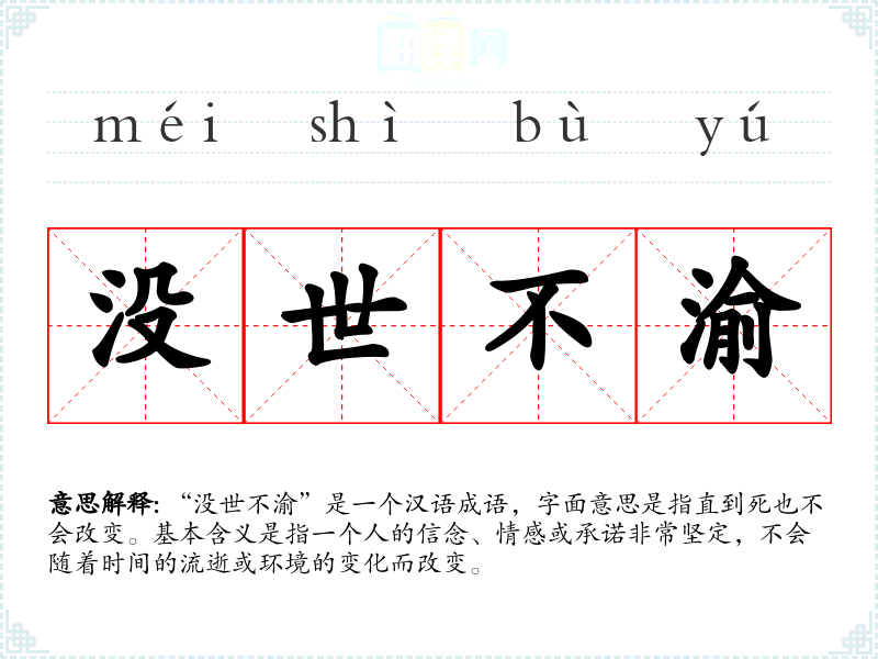 “没世不渝”是一个汉语成语,字面意思是指直到死也不会改变。基本含义是指一个人的信念、情感或承诺非常坚定,不会随着时间的流逝或环境的变化而改变。