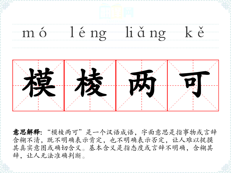 “模棱两可”是一个汉语成语,字面意思是指事物或言辞含糊不清,既不明确表示肯定,也不明确表示否定,让人难以捉摸其真实意图或确切含义。基本含义是指态度或言辞不明确,含糊其辞,让人无法准确判断。