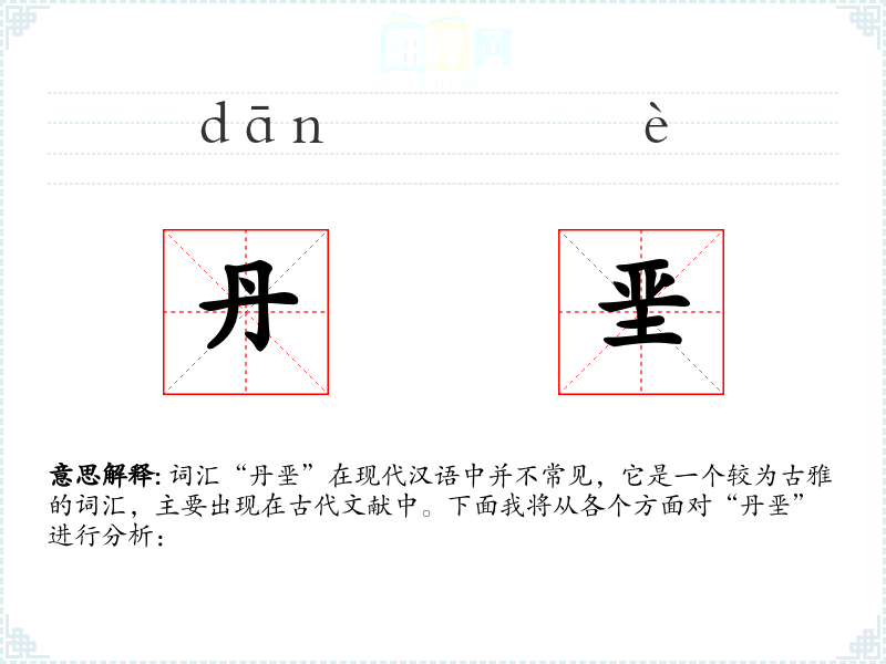 “丹垩”一词由两个字组成:“丹”和“垩”。其中,“丹”通常指红色,如丹砂、丹心等;“垩”则指白色的土,如垩室(用白土涂刷的房间)。因此,“丹垩”字面意思是指红色和白色,但在古代文献中,它更多地被用来形容色彩鲜明或装饰华丽的场景。