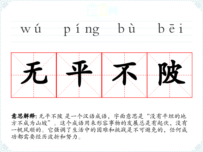 在传统文化中,无平不陂** 反映了儒家思想中的“天行健,君子以自强不息”的理念,即强调个人应该不断努力,面对困难不退缩。在现代社会,这个成语仍然被广泛使用,特别是在教育和励志的语境中。
