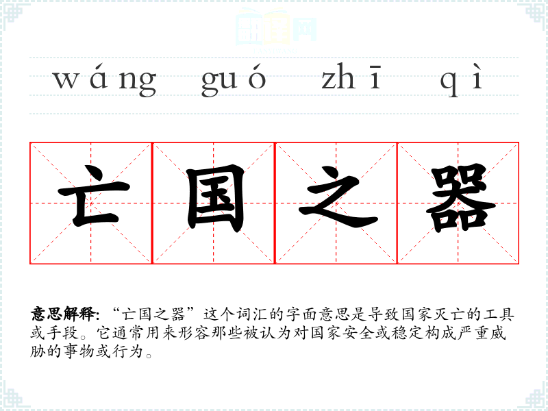 “亡国之器”这个词汇的字面意思是导致国家灭亡的工具或手段。它通常用来形容那些被认为对国家安全或稳定构成严重威胁的事物或行为。