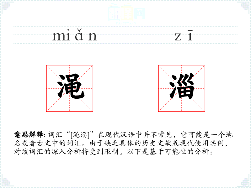 词汇“[渑淄]”在现代汉语中并不常见,它可能是一个地名或者古文中的词汇。由于缺乏具体的历史文献或现代使用实例,对该词汇的深入分析将受到限制。以下是基于可能性的分析: