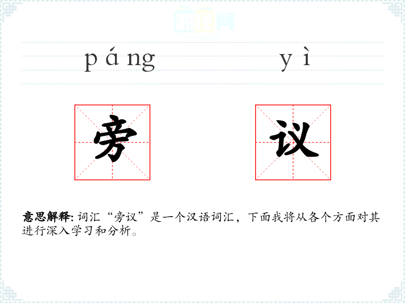 “旁议”字面意思是指在旁边进行的议论或讨论,通常指的是非正式的、非官方的意见或建议。它强调的是在主要议题或决策之外的旁观者的意见。