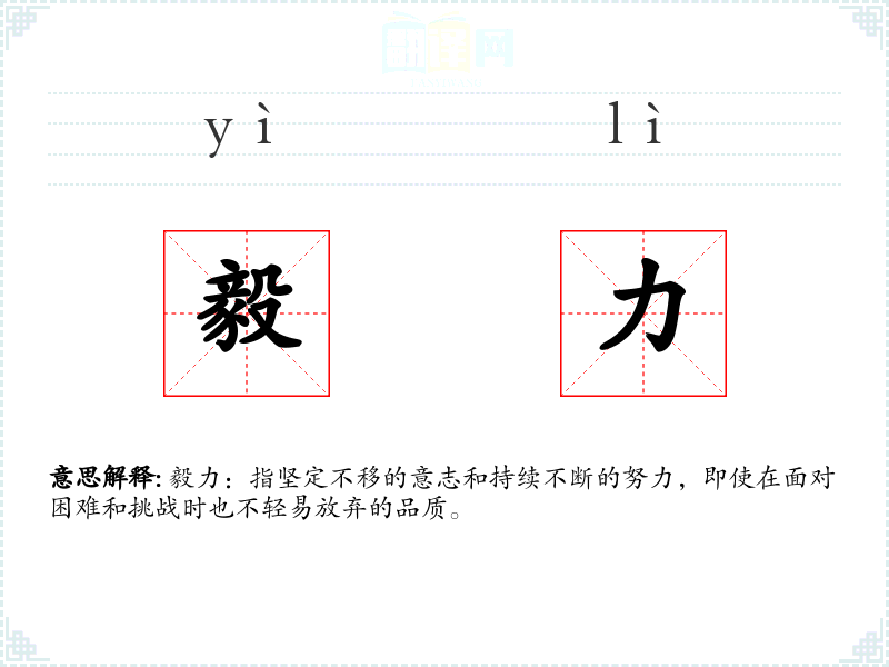毅力:指坚定不移的意志和持续不断的努力,即使在面对困难和挑战时也不轻易放弃的品质。
