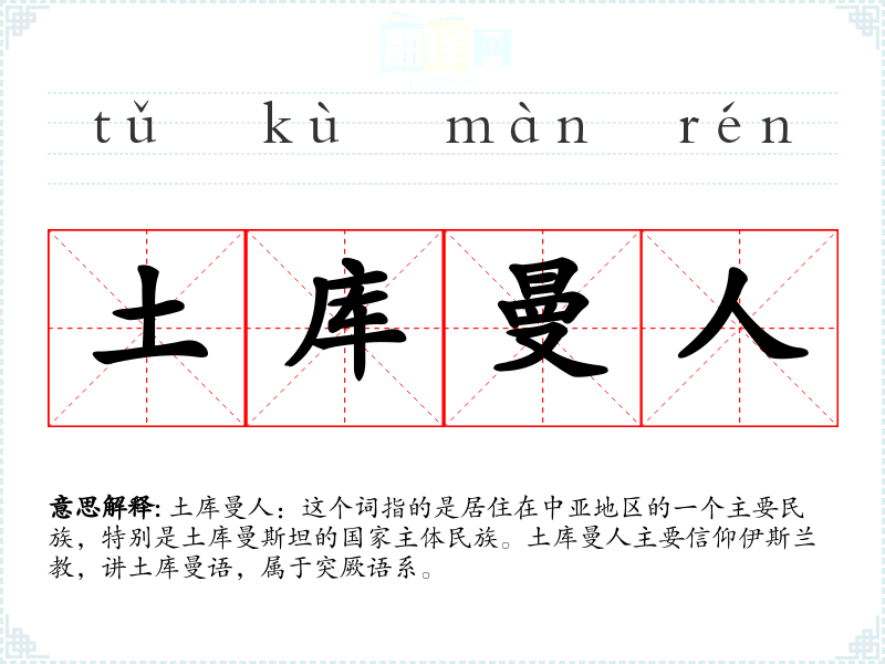 同义词:土库曼族、土库曼斯坦人 反义词:非土库曼人(如其他中亚民族或外国人)