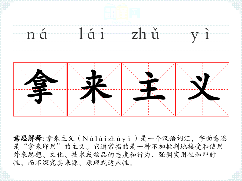 拿来主义(Nálái zhǔyì)是一个汉语词汇,字面意思是“拿来即用”的主义。它通常指的是一种不加批判地接受和使用外来思想、文化、技术或物品的态度和行为,强调实用性和即时性,而不深究其来源、原理或适应性。