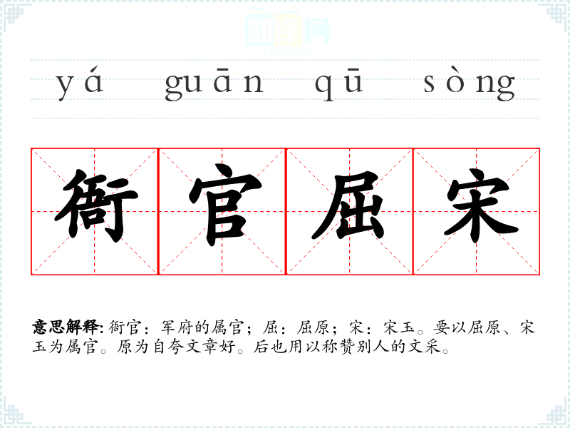 衙官:军府的属官;屈:屈原;宋:宋玉。要以屈原、宋玉为属官。原为自夸文章好。后也用以称赞别人的文采。
