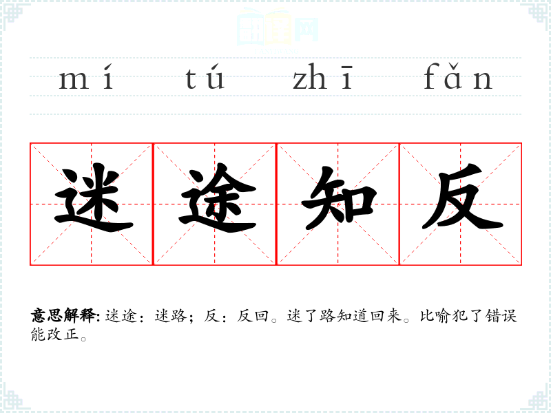 迷途:迷路;反:反回。迷了路知道回来。比喻犯了错误能改正。