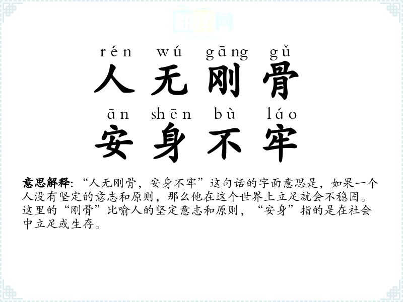 “人无刚骨,安身不牢”这句话的字面意思是,如果一个人没有坚定的意志和原则,那么他在这个世界上立足就会不稳固。这里的“刚骨”比喻人的坚定意志和原则,“安身”指的是在社会中立足或生存。