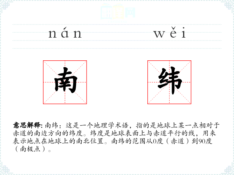 词源:南纬这个词由“南”和“纬”组成。“南”指的是方向,“纬”指的是纬度,即地球上的横向坐标。 演变:随着地理知识的普及和全球化交流的增加,南纬作为一个精确描述地理位置的术语,其使用频率和重要性逐渐增加。