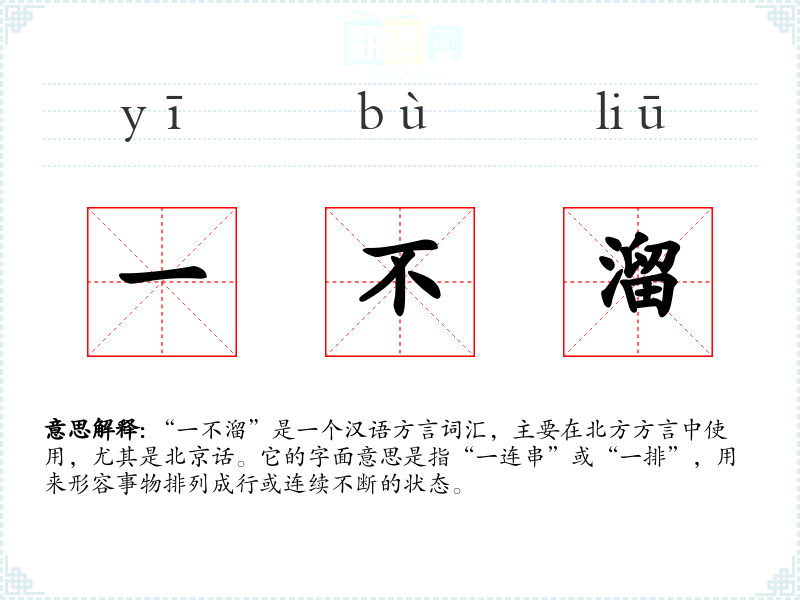 “一不溜”是一个汉语方言词汇,主要在北方方言中使用,尤其是北京话。它的字面意思是指“一连串”或“一排”,用来形容事物排列成行或连续不断的状态。