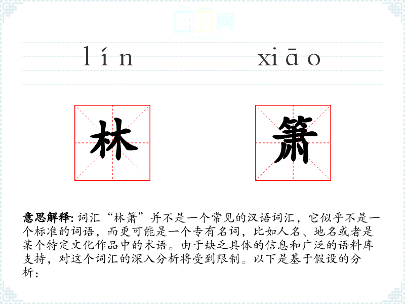 由于“林箫”不是一个标准词汇,我们无法给出确切的基本定义。如果它是一个人名,那么它可能代表一个具体的人;如果是一个地名,它可能指代某个地方;如果是在某个文学作品中,它可能是作者创造的一个角色或者象征。