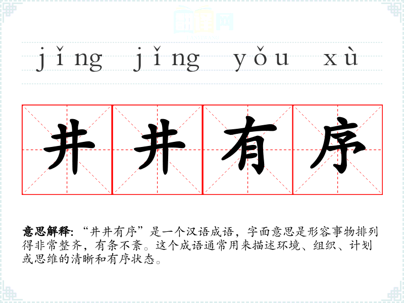 “井井有序”是一个汉语成语,字面意思是形容事物排列得非常整齐,有条不紊。这个成语通常用来描述环境、组织、计划或思维的清晰和有序状态。