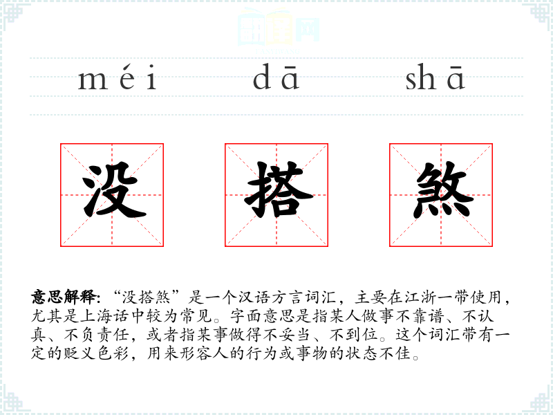 “没搭煞”是一个汉语方言词汇,主要在江浙一带使用,尤其是上海话中较为常见。字面意思是指某人做事不靠谱、不认真、不负责任,或者指某事做得不妥当、不到位。这个词汇带有一定的贬义色彩,用来形容人的行为或事物的状态不佳。