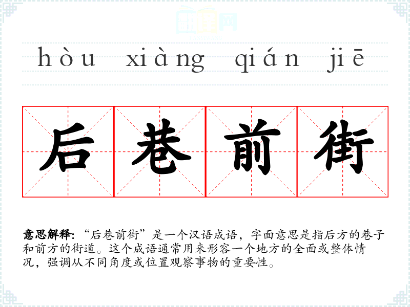 “后巷前街”这个成语的词源较为直接,由“后巷”和“前街”两个词组合而成,强调从不同位置观察事物的全面性。在古代汉语中,这个成语可能更多用于描述城市的地理布局,随着时间的推移,其含义逐渐扩展到更广泛的语境中。
