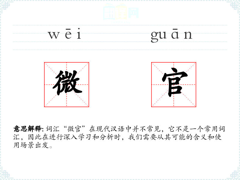 “微官”字面意思可以理解为“小官员”或“低级别的官员”。其中,“微”字通常表示小、轻微、不重要,而“官”字则指官员、官职。
