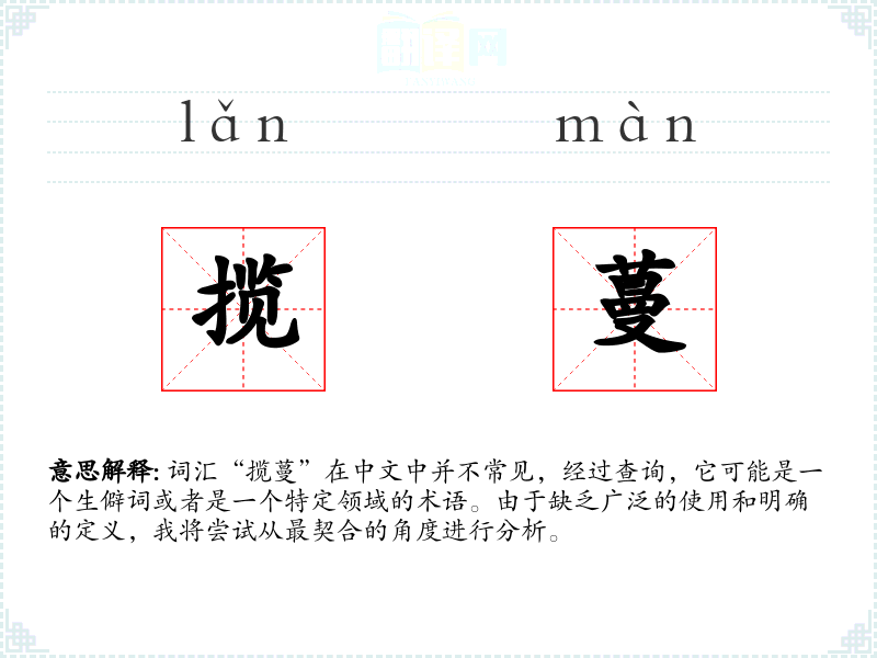 词汇“揽蔓”在中文中并不常见,经过查询,它可能是一个生僻词或者是一个特定领域的术语。由于缺乏广泛的使用和明确的定义,我将尝试从最契合的角度进行分析。
