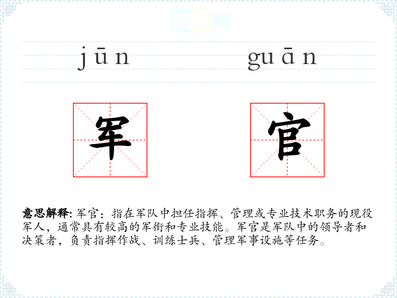 军官:指在军队中担任指挥、管理或专业技术职务的现役军人,通常具有较高的军衔和专业技能。军官是军队中的领导者和决策者,负责指挥作战、训练士兵、管理军事设施等任务。