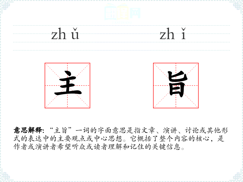 “主旨”一词的字面意思是指文章、演讲、讨论或其他形式的表达中的主要观点或中心思想。它概括了整个内容的核心,是作者或演讲者希望听众或读者理解和记住的关键信息。