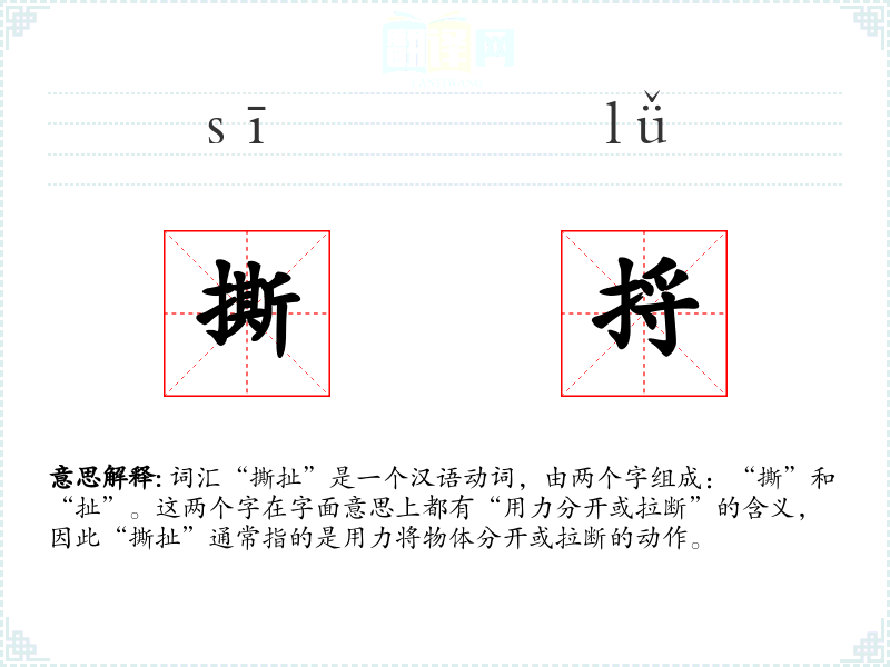 词汇“撕扯”是一个汉语动词,由两个字组成:“撕”和“扯”。这两个字在字面意思上都有“用力分开或拉断”的含义,因此“撕扯”通常指的是用力将物体分开或拉断的动作。