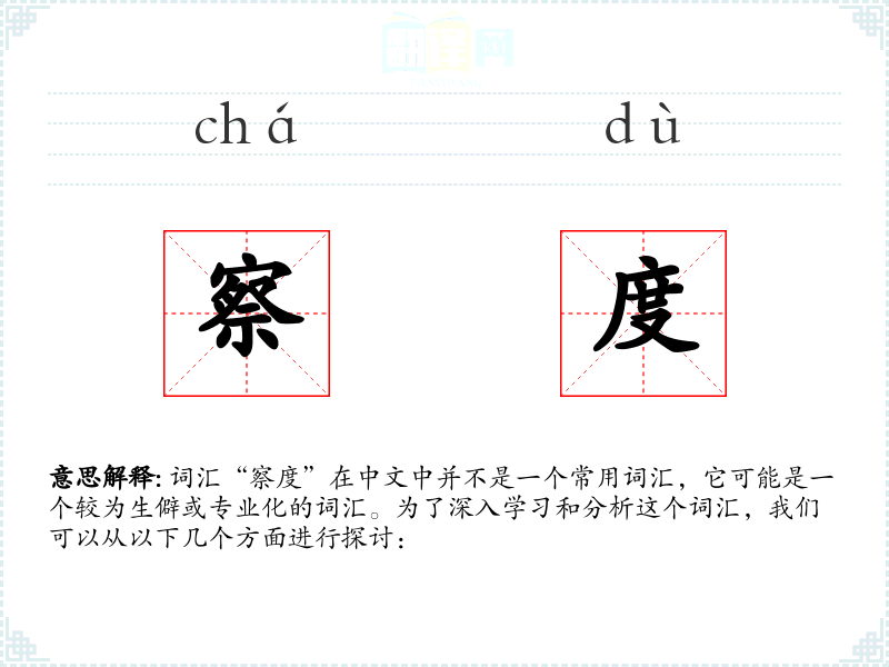 词汇“察度”在中文中并不是一个常用词汇,它可能是一个较为生僻或专业化的词汇。为了深入学习和分析这个词汇,我们可以从以下几个方面进行探讨: