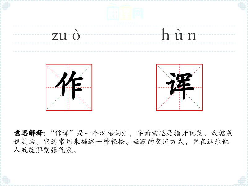 “作诨”是一个汉语词汇,字面意思是指开玩笑、戏谑或说笑话。它通常用来描述一种轻松、幽默的交流方式,旨在逗乐他人或缓解紧张气氛。