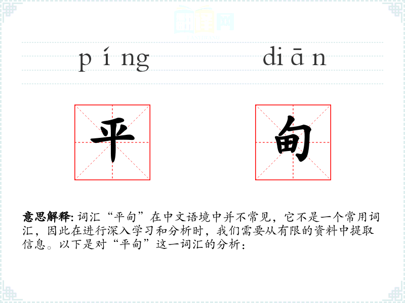 词汇“平甸”在中文语境中并不常见,它不是一个常用词汇,因此在进行深入学*和分析时,我们需要从有限的资料中提取信息。以下是对“平甸”这一词汇的分析: