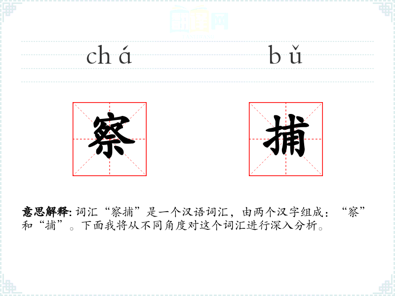 词汇“察捕”是一个汉语词汇,由两个汉字组成:“察”和“捕”。下面我将从不同角度对这个词汇进行深入分析。