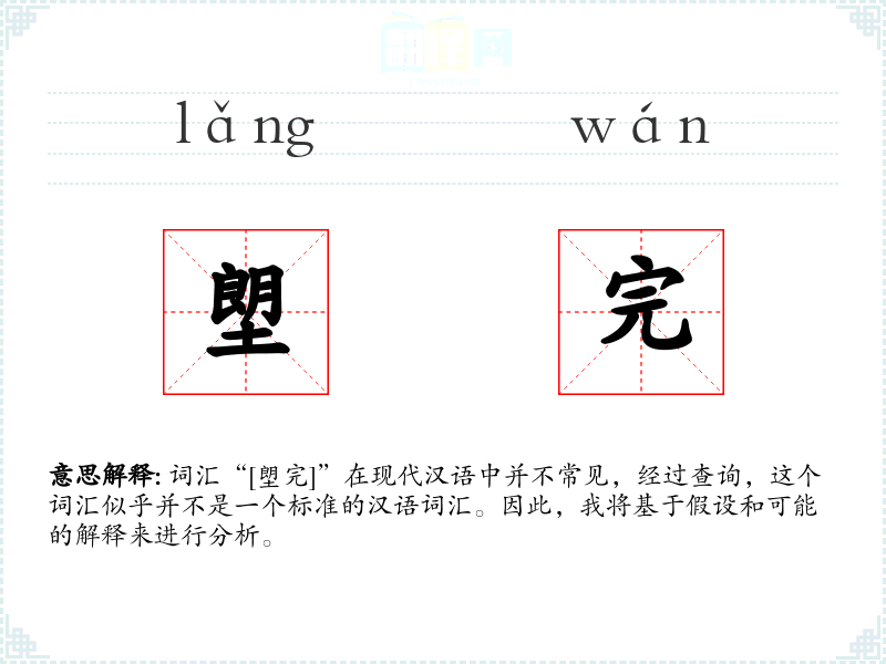 由于“[塱完]”不是一个标准的汉语词汇,我们无法提供确切的分析。在语言学习中,了解和掌握标准词汇是非常重要的,这有助于更准确地表达和理解。对于不常见的词汇,我们应该通过更多的研究和查询来确定其含义和用法。