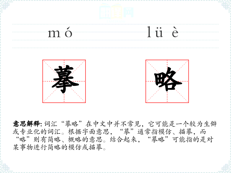 “摹略”的字面意思是对某事物进行简略的模仿或描摹,可能涉及对事物特征的概括性复制。