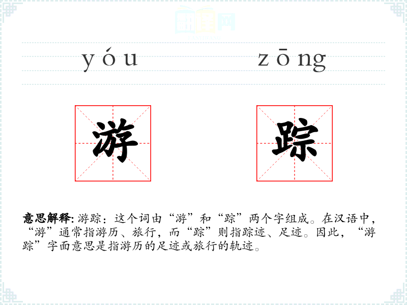游踪:这个词由“游”和“踪”两个字组成。在汉语中,“游”通常指游历、旅行,而“踪”则指踪迹、足迹。因此,“游踪”字面意思是指游历的足迹或旅行的轨迹。