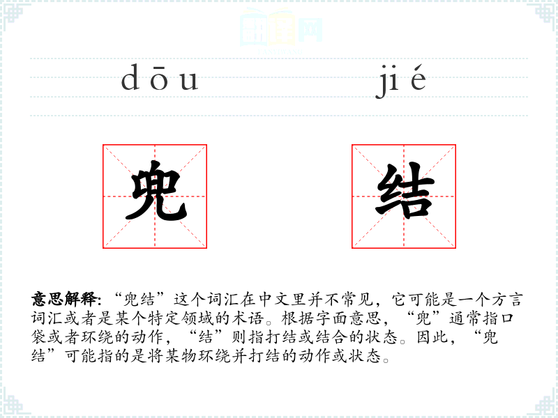 “兜结”这个词汇在中文里并不常见,它可能是一个方言词汇或者是某个特定领域的术语。根据字面意思,“兜”通常指口袋或者环绕的动作,“结”则指打结或结合的状态。因此,“兜结”可能指的是将某物环绕并打结的动作或状态。