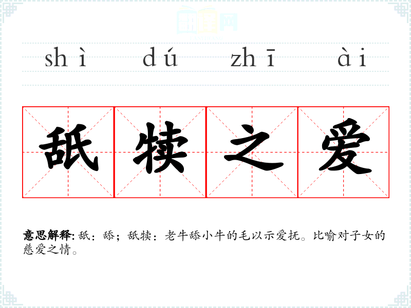 舐:舔;舐犊:老牛舔小牛的毛以示爱抚。比喻对子女的慈爱之情。