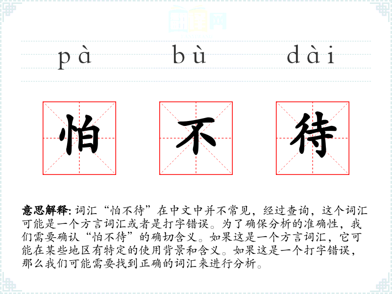 词汇“怕不待”在中文中并不常见,经过查询,这个词汇可能是一个方言词汇或者是打字错误。为了确保分析的准确性,我们需要确认“怕不待”的确切含义。如果这是一个方言词汇,它可能在某些地区有特定的使用背景和含义。如果这是一个打字错误,那么我们可能需要找到正确的词汇来进行分析。