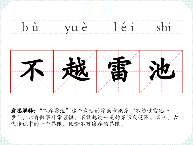“不越雷池”这个成语的字面意思是“不越过雷池一步”,比喻做事非常谨慎,不敢越过一定的界限或范围。雷池,古代传说中的一个界限,比喻不可逾越的界限。