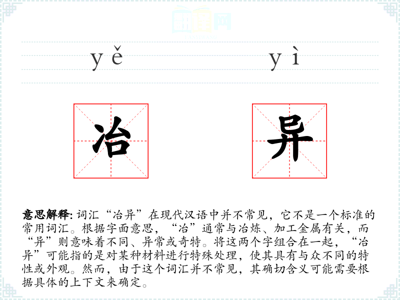 由于“冶异”不是一个常用词汇,其词源和演变不太明确。它可能是由“冶”和“异”两个字组合而成,用以描述一种特殊的工艺或处理方法。
