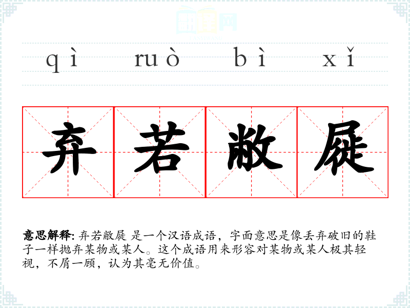 弃若敝屣 这个成语在表达对某物或某人的极端轻视时非常有用,它不仅丰富了语言的表达,也反映了社会和文化的价值观。在学*语言和表达时,理解和正确使用这样的成语是非常重要的。