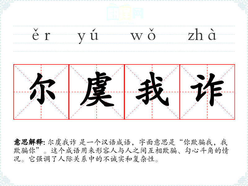 尔虞我诈 是一个汉语成语,字面意思是“你欺骗我,我欺骗你”。这个成语用来形容人与人之间互相欺骗、勾心斗角的情况。它强调了人际关系中的不诚实和复杂性。